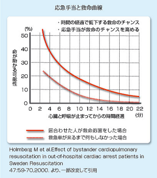 このグラフは応急手当と救命曲線といって、心臓が止まってからの時間経過と時間低下で低下す救命のチャンス、応急手当をすることによって救命のチャンスがどれだけ高まるかを表示したものです。(出展:総務省消防庁) |